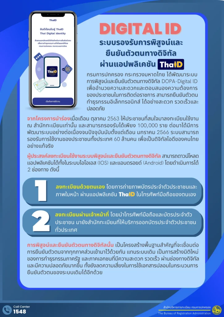 กรมการปกครองขับเคลื่อนโครงการพัฒนาระบบการพิสูจน์และยืนยันตัวตนทางดิจิทัล (DOPA-Digital ID) ผ่านแอปพลิเคชัน ThaID เพื่อสร้างต้นแบบและนวัตกรรมใหม่ในการพิสูจน์และยืนยันตัวตนทางดิจิทัลของประเทศรองรับการใช้งานบริการภาครัฐ